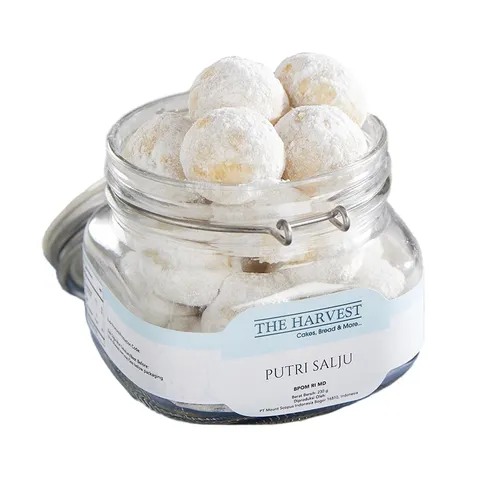 Celebrate the spirit of Idul Fitri with The Harvest premium Putri Salju cookies. Made with high-quality ingredients like icing sugar, salt, cashew nuts, and peanut butter cream, each bite delivers a delightful combination of sweetness and nuttiness. Presented in an elegant glass jar, the pristine white coating of Putri Salju symbolizes the purity and renewal of Idul Fitri.