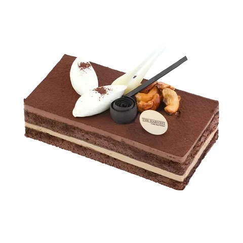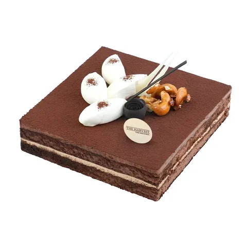Combination of coffee mousse with dark chocolate mousse, layers of soft chocolate sponge soaked in coffee syrup decorate with fresh cream, caramelized cashew and dust of cocoa powder